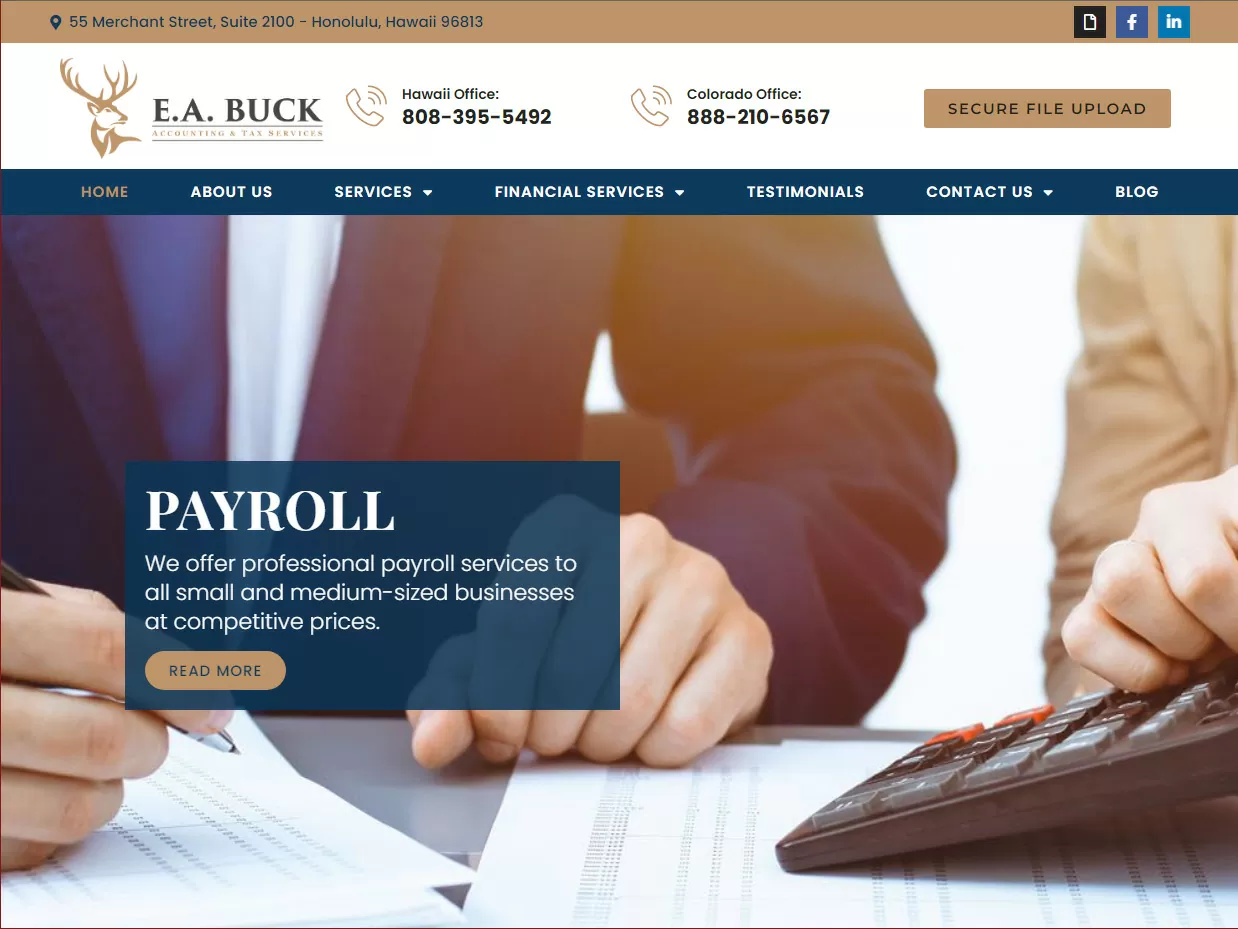 E.A. Buck Accounting & Tax Services is an accounting firm that is situated in the US. The company has offices in Colorado and California. The HQ office is located in Hawaii. They provide a wide range of services for small and medium-sized businesses and help with accounting, tax, bookkeeping and payroll.
