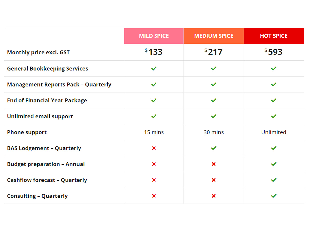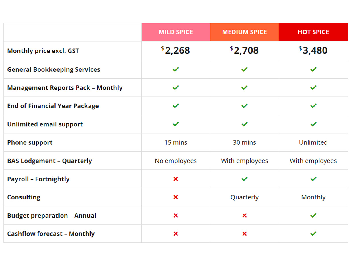 We offer five different package options, and within each of these, there are three levels of spice to choose from. This means you can select the option that best reflects things like your revenues, the size of your team, and the number of bank accounts you have. Within these we provide everything from general bookkeeping assistance, through to payroll processing, BAS lodgements, and strategic advisory support. Not sure which package to choose? Book a complimentary consultation with us, and we’ll provide tailored advice to ensure you select the option that best suits your unique requirements.